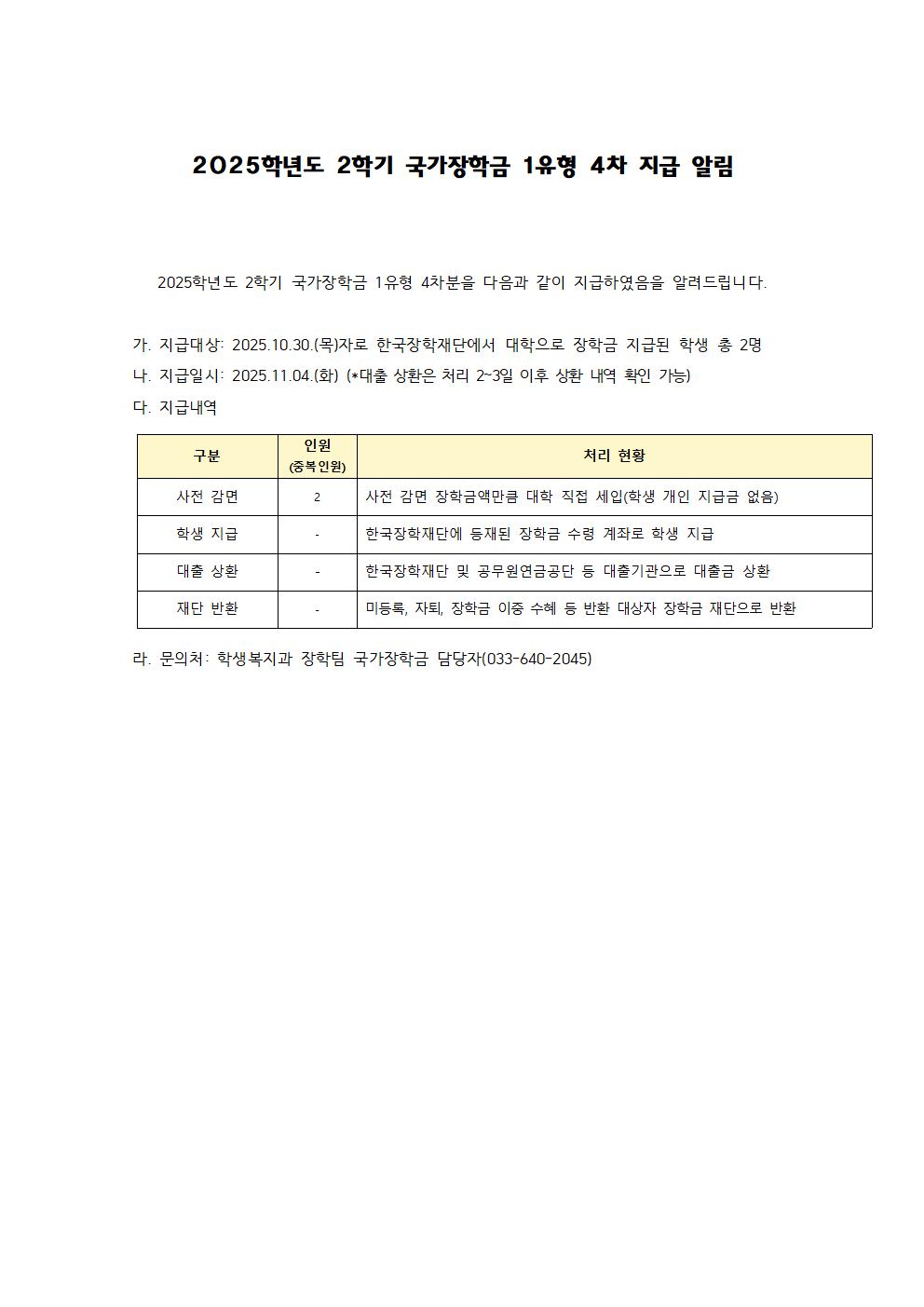2025학년도 2학기 국가장학금 1유형 4차 지급 알림