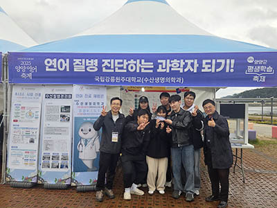 수산생명의학과(학과장 김영철)는 10월 24일(금)부터 25일(토)까지 강원특별자치도 양양군 남대천 일원에서 열린 ‘2025 양양연어축제’에 참여해 학과 특성을 반영한 ‘연어 질병 진단 체험하기’ 체험 부스를 운영했다.